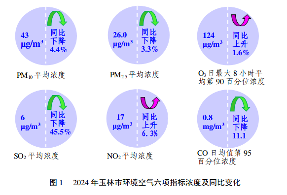2024年,玉林市环境空气质量优良天数比例为98.1%,同比下降0.8%。PM10累计平均浓度为43微克/立方米,同比下降4.4%;PM2.5累计平均浓度为26.0微克/立方米,同比下降3.3%;环境空气质量综合指数为2.85,同比下降4.0%。