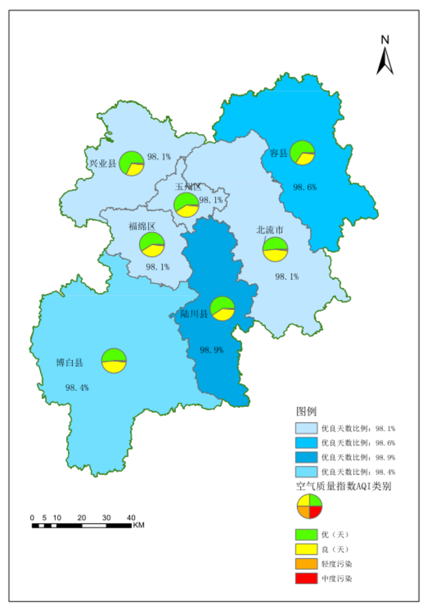 2024年,玉林市和8个县(市、区)环境空气质量优良天数比例为98.1%~98.9%;河流水质优良比例100%;地级城市集中式生活饮用水水源地水源达标率100%。