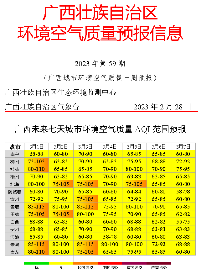 根据《自治区环境空气质量预报信息》(2023年第59期)的预报,受偏南气流影响,大气扩散条件一般,叠加区域传输,我市3月1日-3月3日会出现连续污染天气,首要污染物为PM2.5或O3。为有效预防我市发生污染天气,经研究决定于2023年2月28日0:00启动污染天气Ⅲ级(黄色)预警应急响应,请各县(市、区)人民政府和有关单位务必落实污染天气应急措施。