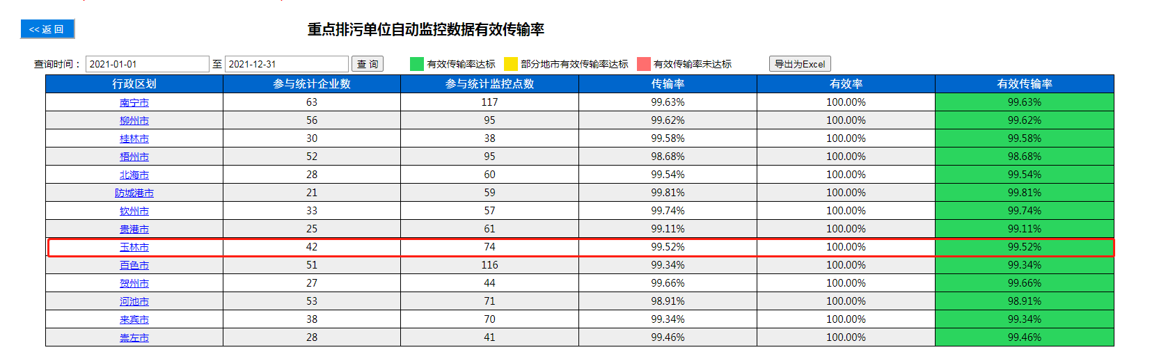 玉林市2021年污染源自动监控数据传输有效率