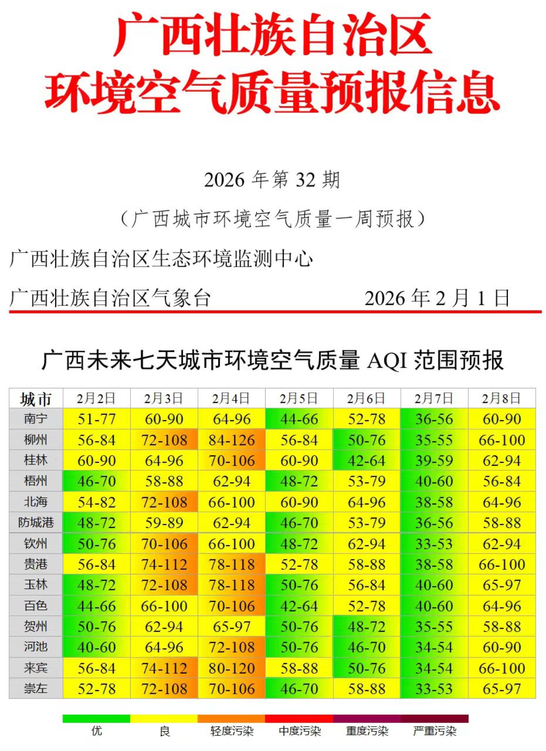 根据《自治区环境空气质量预报信息》(2026年第32期)的预测,2月2日起,地面风速较小,大气扩散条件较差,预计我市存在PM2.5浓度上升的污染风险。为确保我市空气质量优良,经研究决定于2026年2月2日16:00启动重污染天气Ⅲ级(黄色)预警应急响应,请各县(市、区)人民政府,玉林高新区(玉东新区)管委和市有关单位按照《玉林市重污染天气应急预案》(玉政办函〔2025〕23号)文件要求,加强联防联控,落实各项应急管控措施。