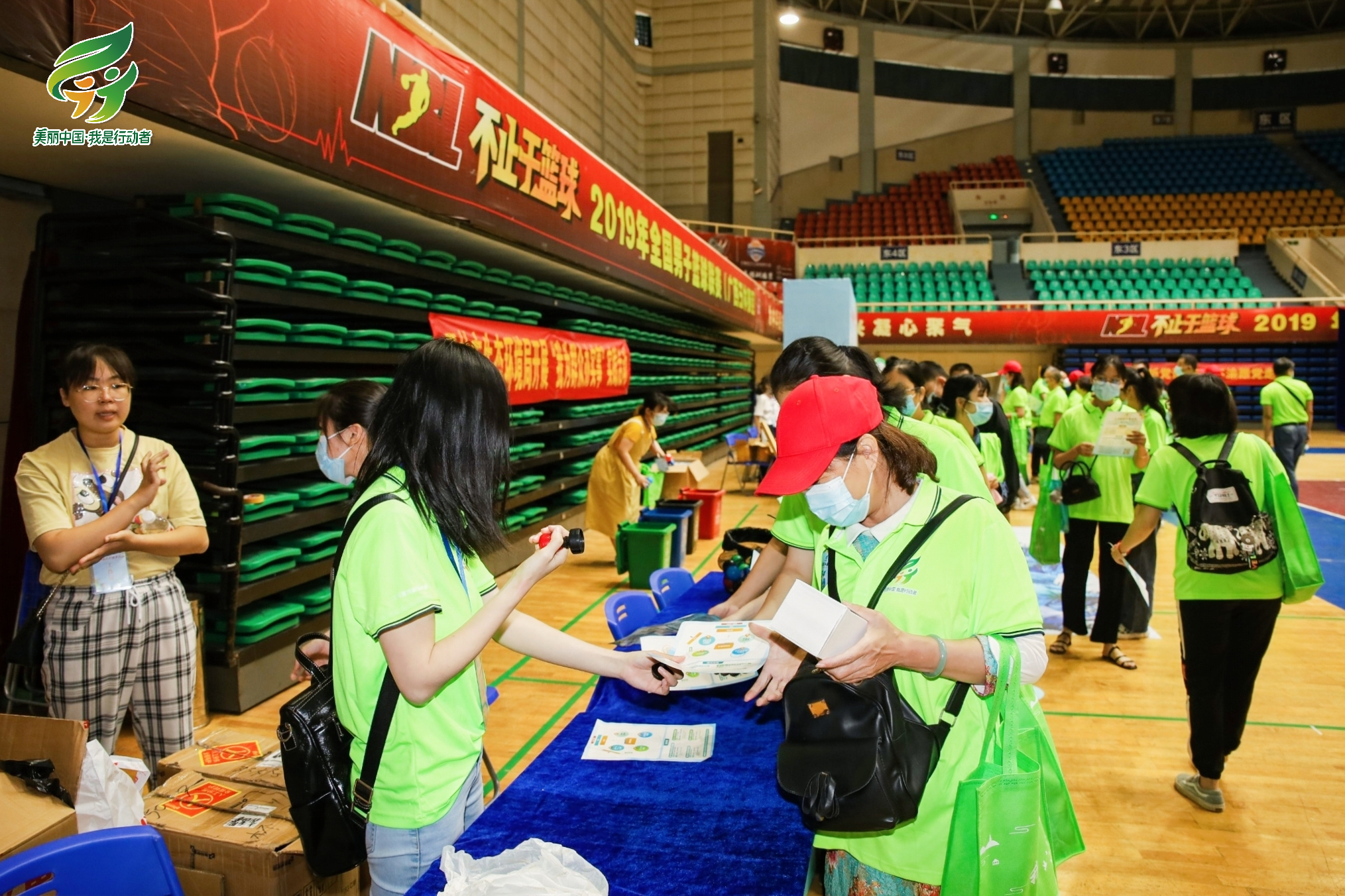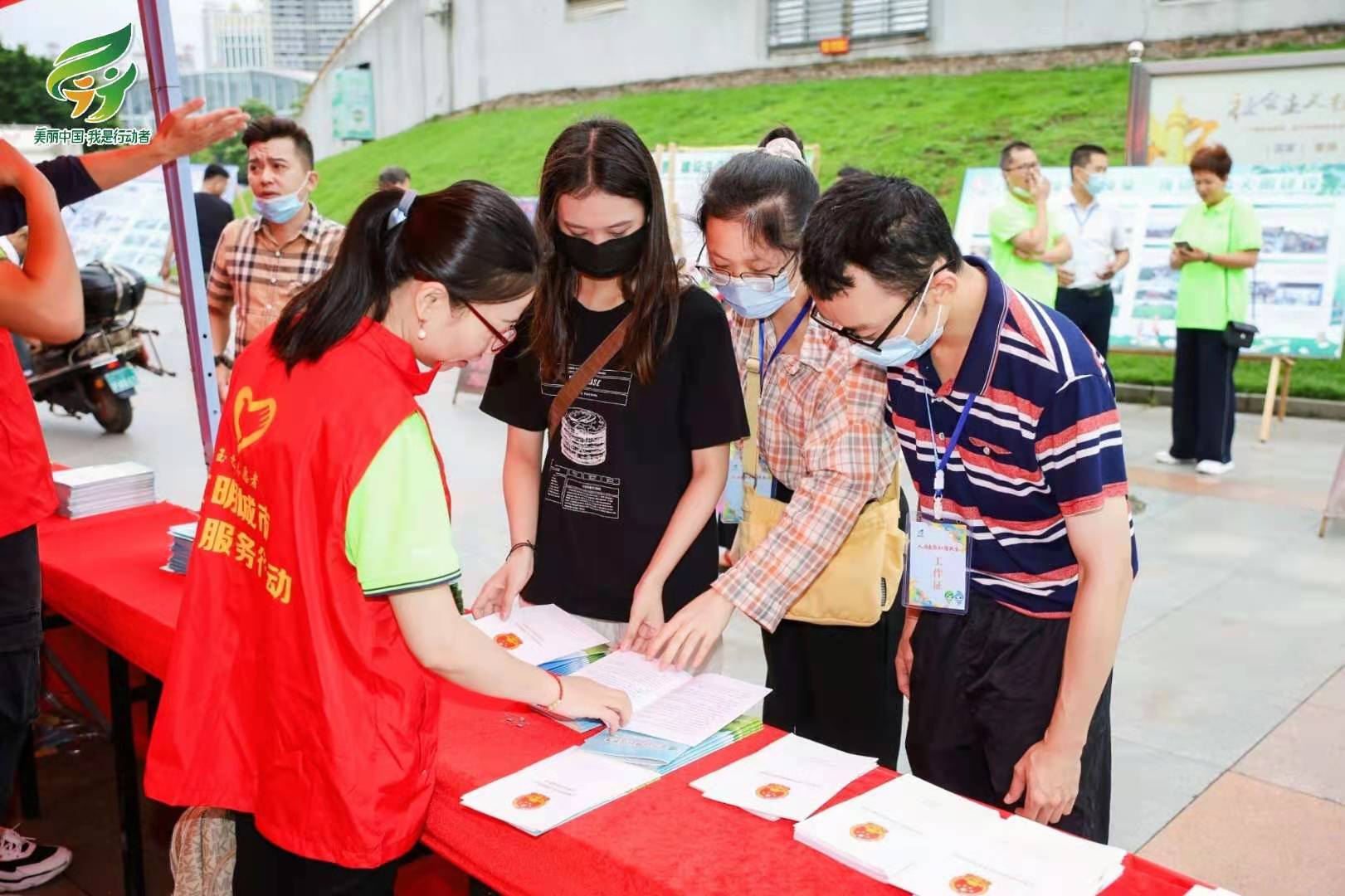 在体育馆外,志愿者通过讲解、发放宣传资料、摆放宣传栏等方式,向市民介绍保护生态环境、垃圾分类等的重要意义,号召市民践行低碳生活。